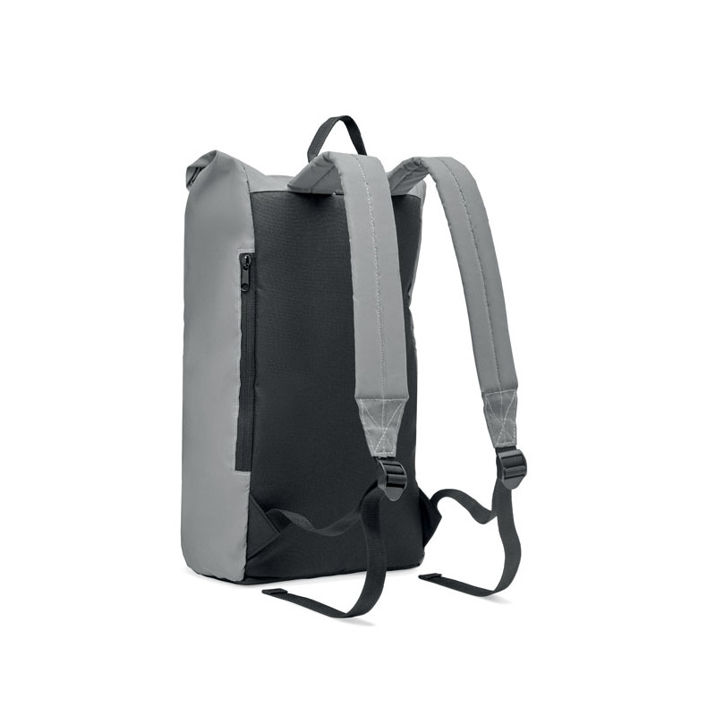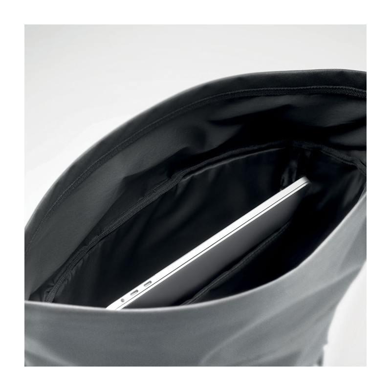 Mochila rolltop portátil 15'' poliéster 190T altamente reflector. Espaço com fecho de gancho e laço. Costas, alças e fundo almofadados. Bolso frontal c/ fecho. Parte inferior poliéster 600D reciclado.