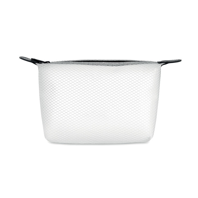 Nécessaire personalizado com logótipo, perfeito para viagens. Fabricado em tecido transparente tipo malha, ideal para organizar e transportar artigos de higiene pessoal.
