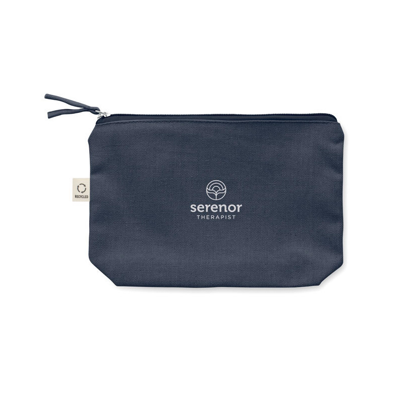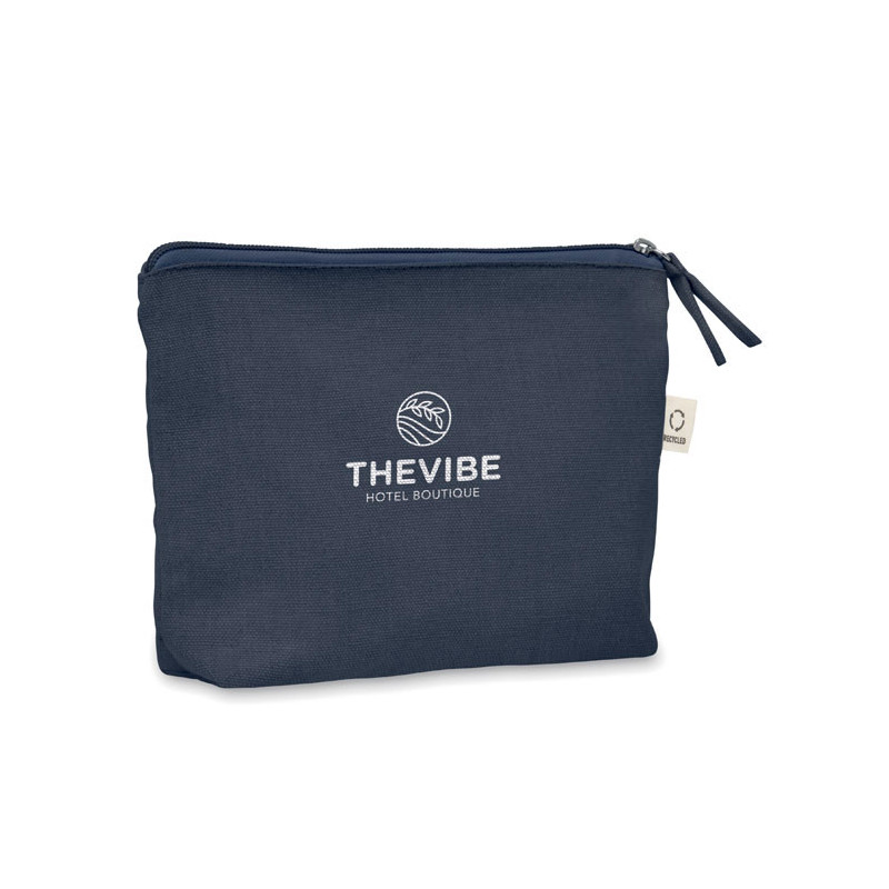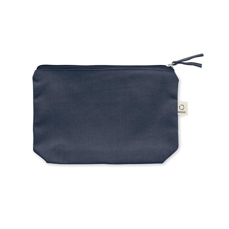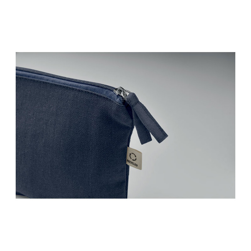 Saco para cosméticos e/ou acessórios em tecido reciclado (70% algodão reciclado e 30% poliéster RPET) com puxador de fecho a condizer. 320 gr/m². Este item pode encolher após a impressão.