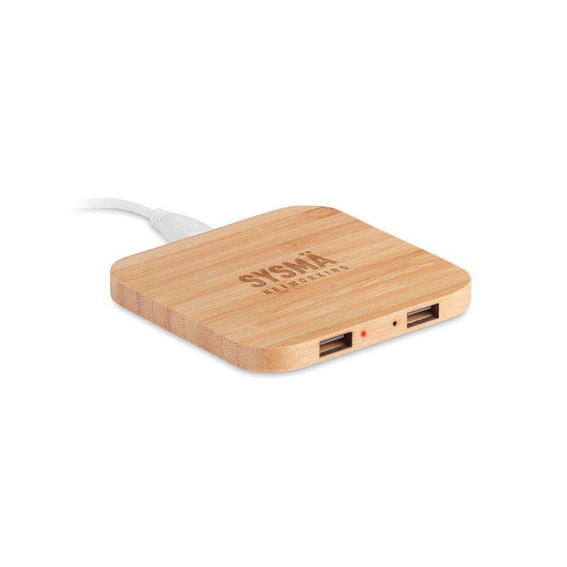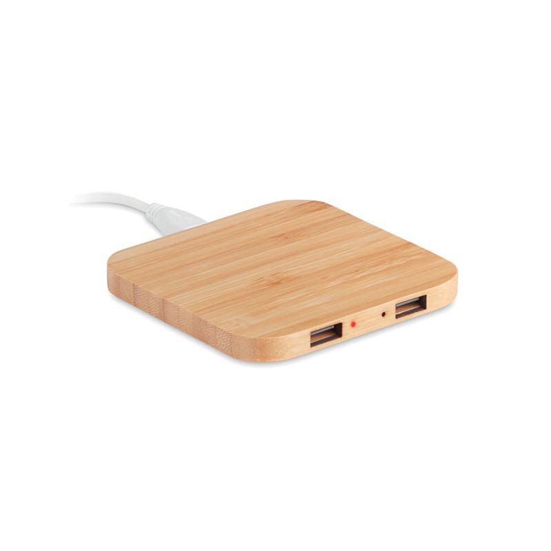 Base de carregamento wireless com HUB de 2 portas USB em bambu. Output DC 5V/1.0A. Compatível com últimos Android, Iphone®8, X ou mais recentes. O bambu é um material natural, a cor do item, o tamanho e a impressão podem variar.
