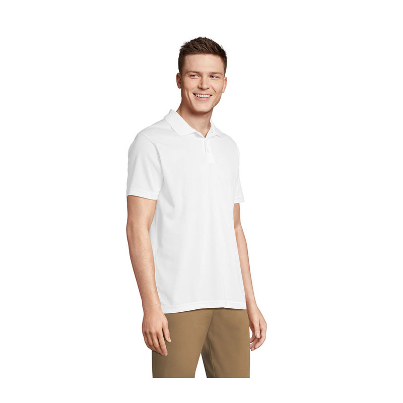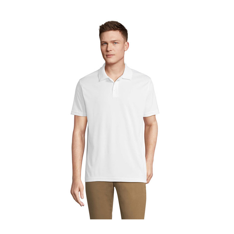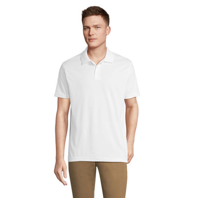Pólo desportivo unissexo em 100% poliéster reciclado. Brinde corporativo sustentável com logotipo, ideal para eventos ou equipas ativas.