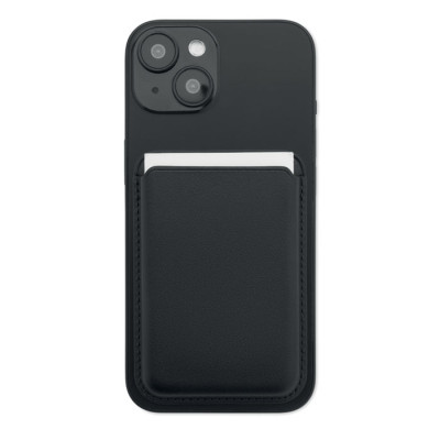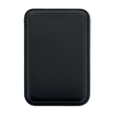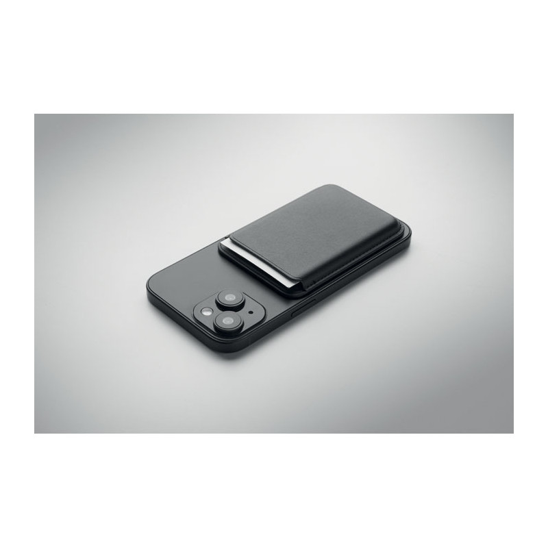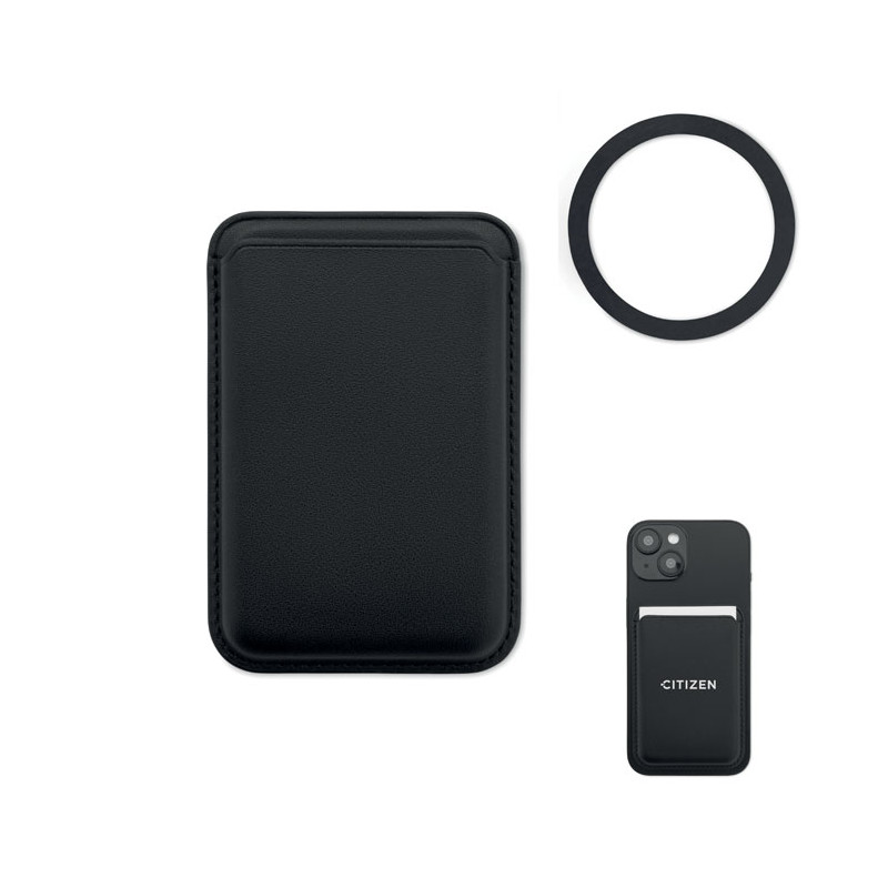Porta-cartões de crédito magnético em pele PU (para 3 cartões) com funcionalidade de suporte. Inclui um anel metálico adicional.