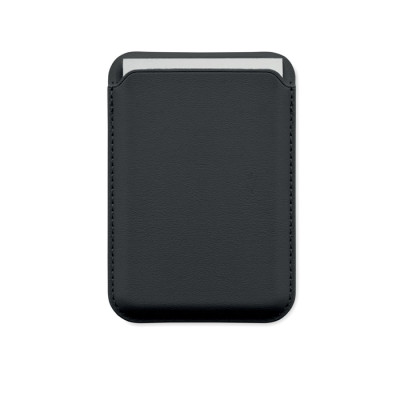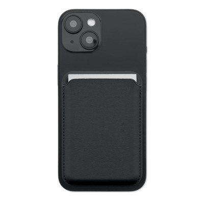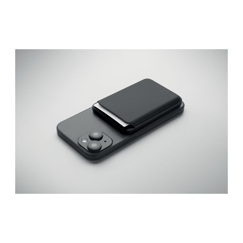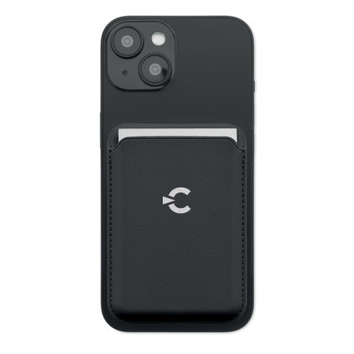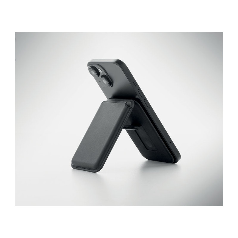 Porta-cartões de crédito magnético em pele PU (para 3 cartões) com funcionalidade de suporte para telemóvel. Inclui um anel metálico adicional.