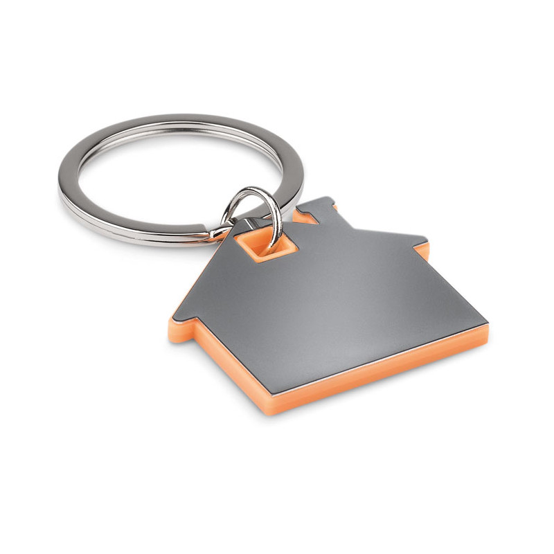 Porta-chaves em forma de casa, fabricado em aço inoxidável e plástico, ideal para brindes promocionais personalizados.