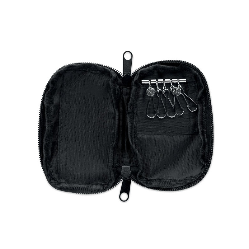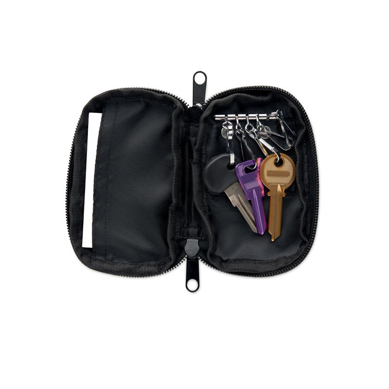 Porta-chaves com fecho de correr. RPET 300D com forro em RPET 210D. Com 5 suportes para chaves.