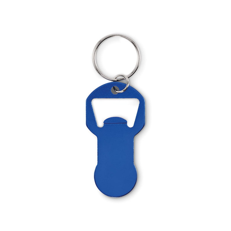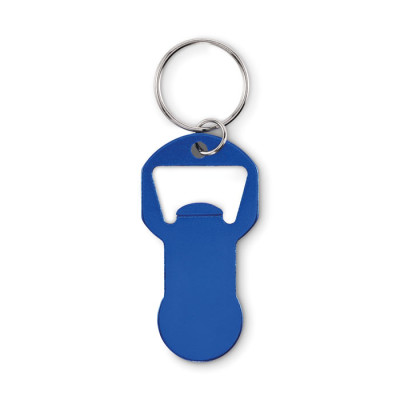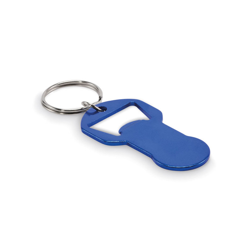 Porta-chaves para abrir garrafas com ficha em alumínio reciclado com argola em ferro.