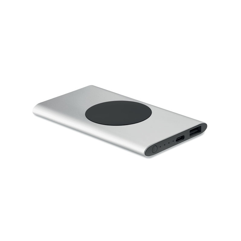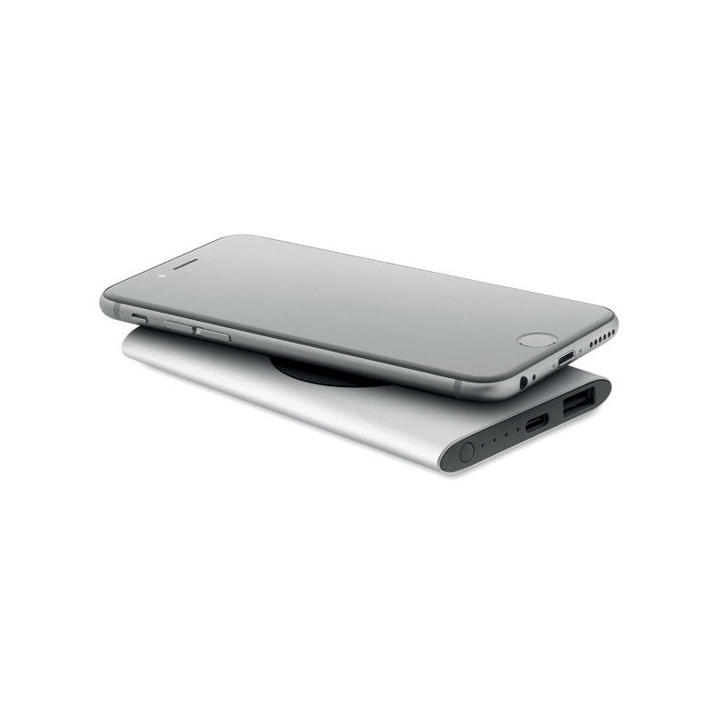 Powerbank de 5000 mAh com carregamento sem fios de 15 W em alumínio reciclado. Entrada: Tipo C. Saída: 1 x Tipo C e 1 x Tipo A. Compatível com os mais recentes androids, iPhone® 8, 8S e X e mais recentes.