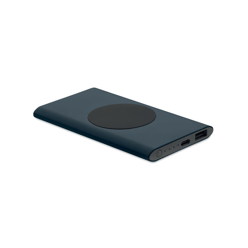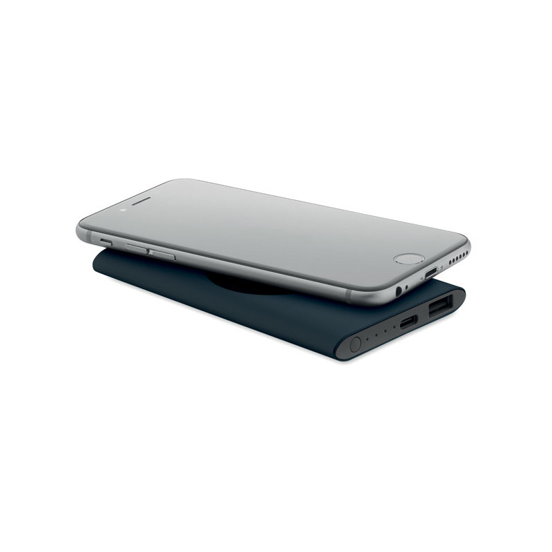 Powerbank de 5000 mAh com carregamento sem fios de 15 W em alumínio reciclado. Entrada: Tipo C. Saída: 1 x Tipo C e 1 x Tipo A. Compatível com os mais recentes androids, iPhone® 8, 8S e X e mais recentes.