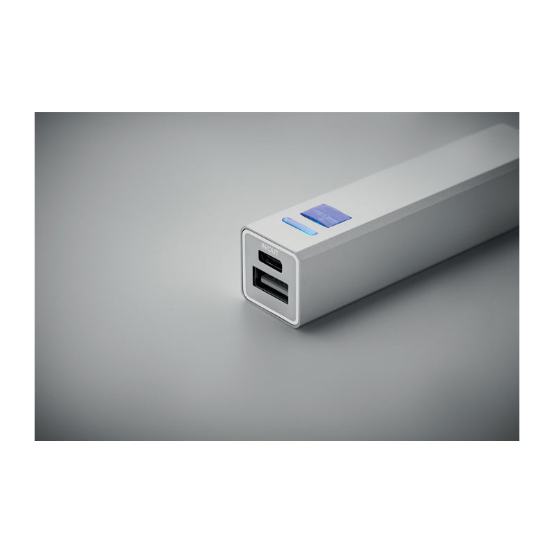 Powerbank de 2600 mAh em caixa de alumínio reciclado. Capacidade para utilização em smartphones, corrente de saída DC5V/1A. Inclui cabo de carregamento USB tipo C com adaptador tipo A. Entrada/Saída: USB Tipo C.