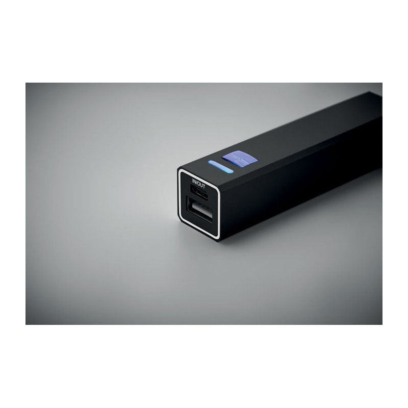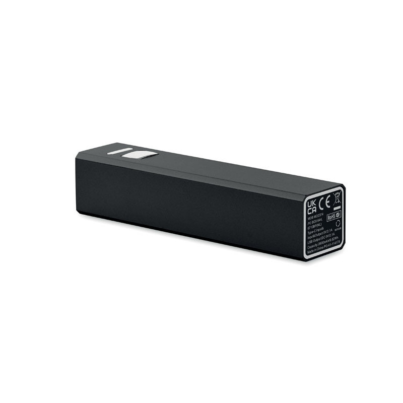 Powerbank de 2600 mAh em caixa de alumínio reciclado. Capacidade para utilização em smartphones, corrente de saída DC5V/1A. Inclui cabo de carregamento USB tipo C com adaptador tipo A. Entrada/Saída: USB Tipo C.