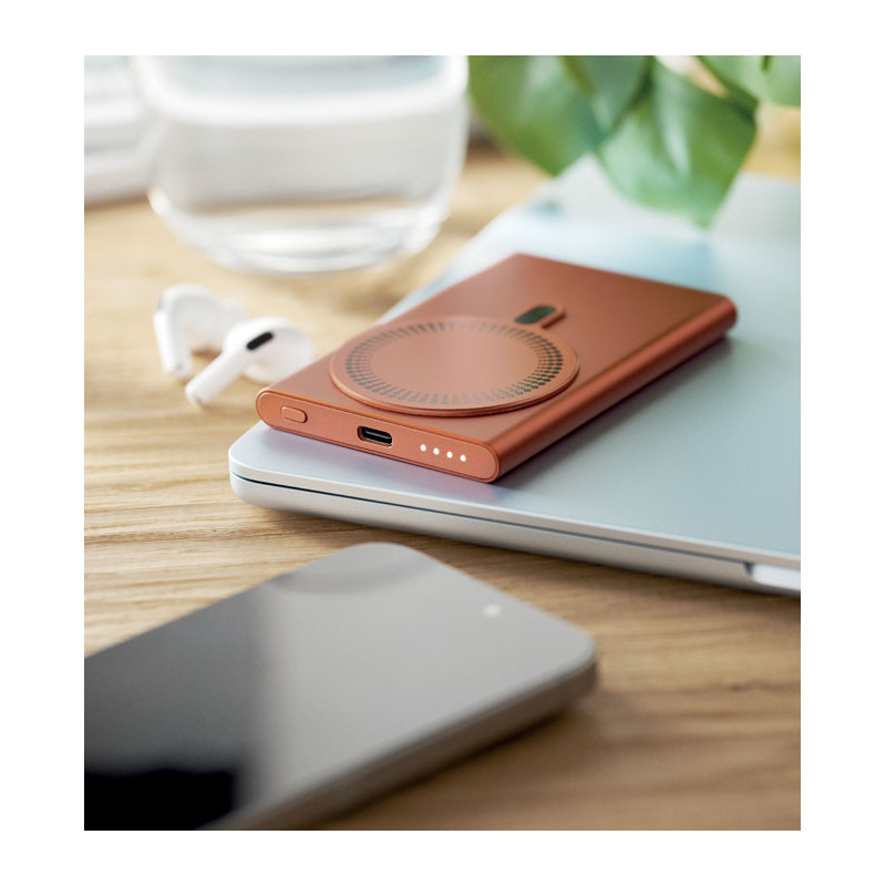 Carregador magnético sem fios (15 W) em alumínio reciclado e power bank (5000 mAh). Saída: DC 9V/1,66A. Suporta a tecnologia de carregamento rápido (20W). Entrada/Saída: Tipo C. Suporte de fornecimento de energia (PD) para carregar o mais recente portátil MacPro®. Entrada/Saída: Tipo C.