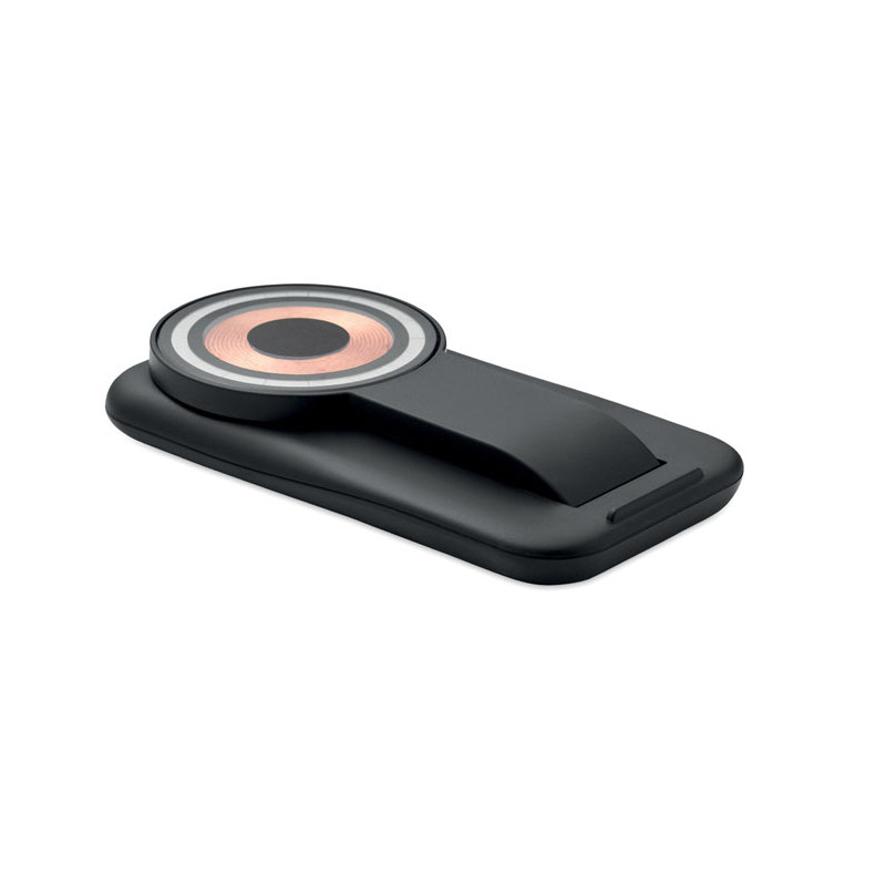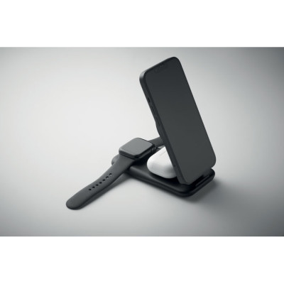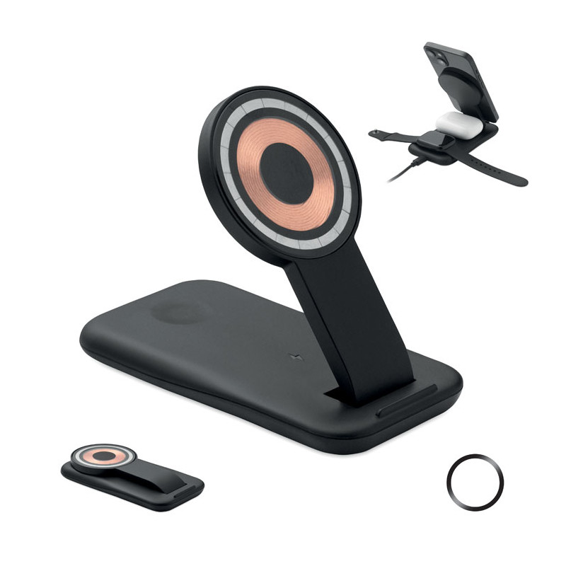 Estação de carregamento 3 em 1 em ABS. Inclui um carregador magnético sem fios de 15 W com funcionalidade de suporte para telemóvel, um carregador TWS e um carregador para smartwatch (apenas Apple®). Compatível com iPhone® 12 e mais recentes.