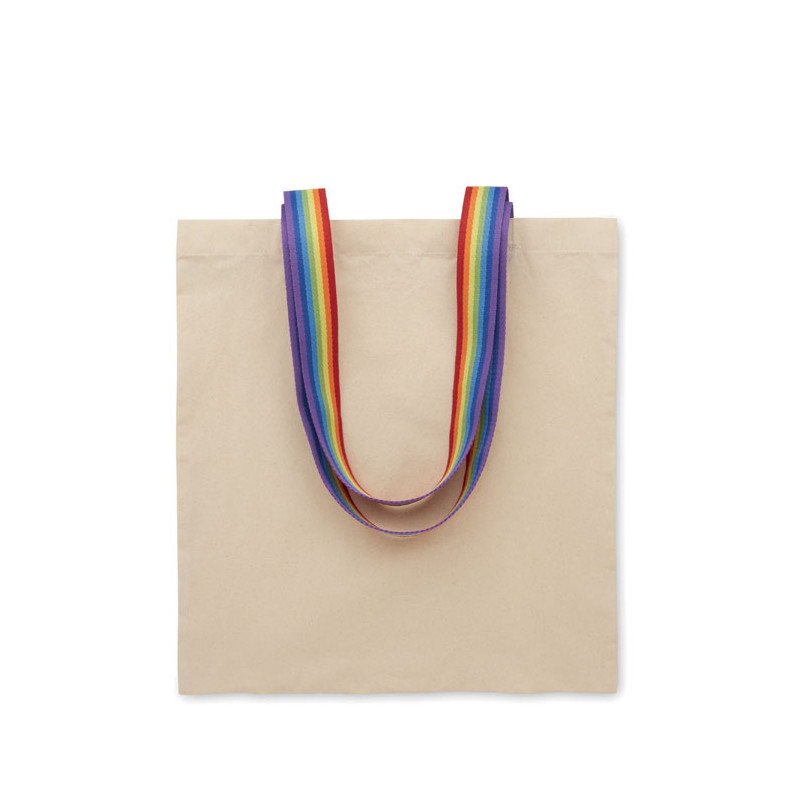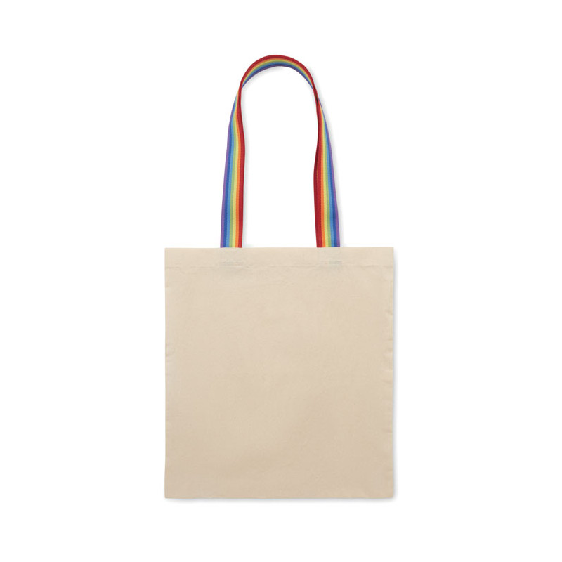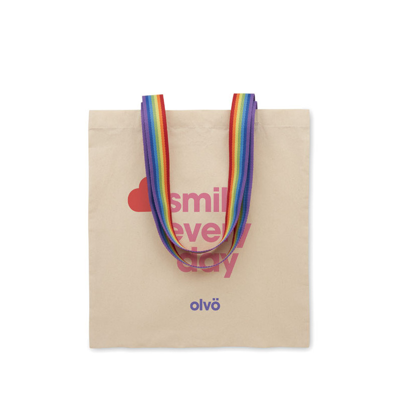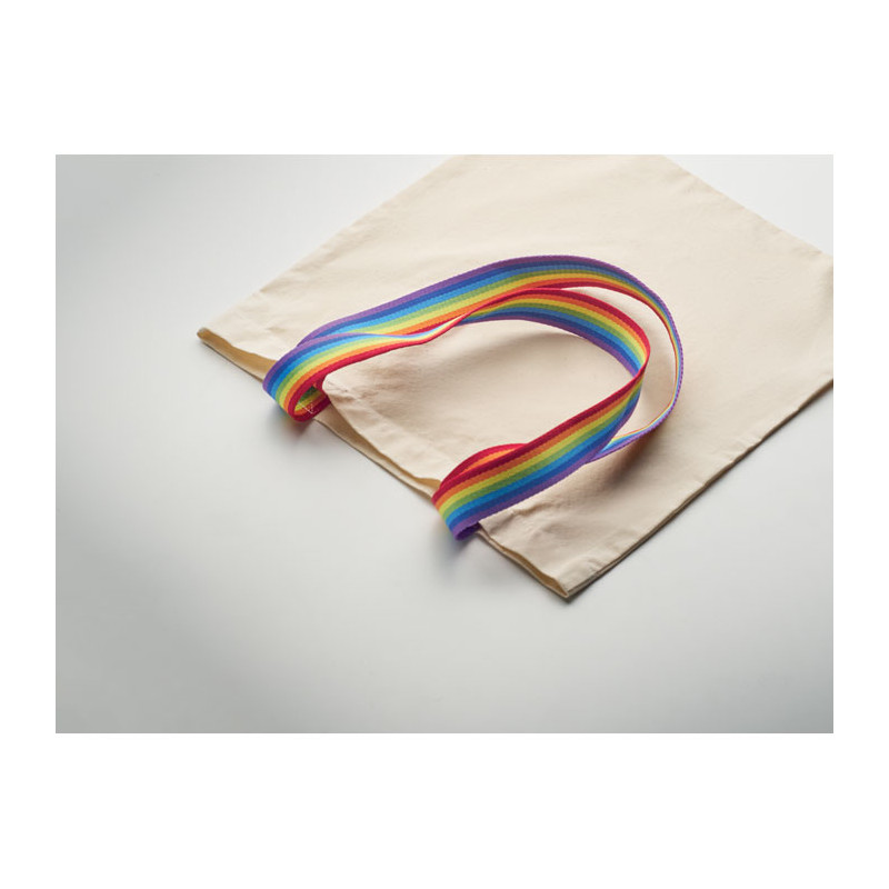 Saco de compras em algodão de 180 gr/m² com pegas na cor do arco-íris. Peso máximo de transporte 2,5 kg.
