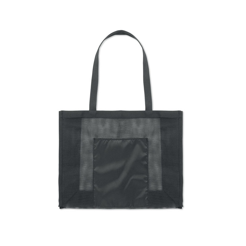 Saco de compras em malha RPET e RPET 210D com pegas curtas. Inclui um grande bolso aberto à frente. Capacidade 20L, carga até 10 kg.