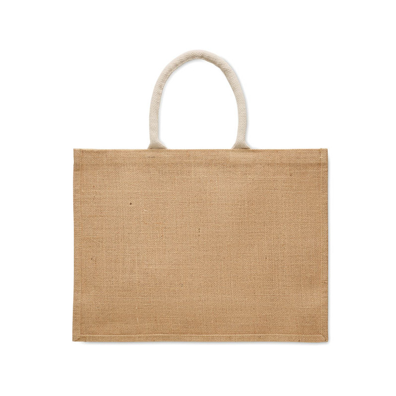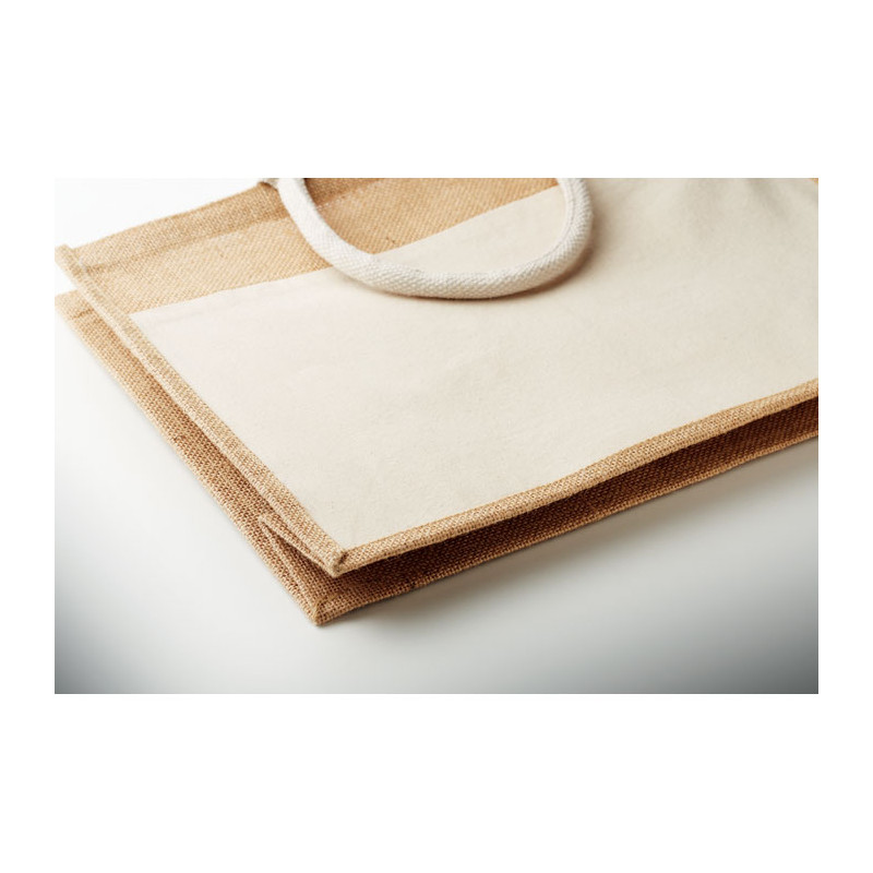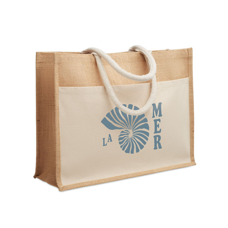 Saco de compras em juta laminada e lona de algodão de 280 gr/m² com pegas em cordão. Inclui um grande bolso aberto à frente.