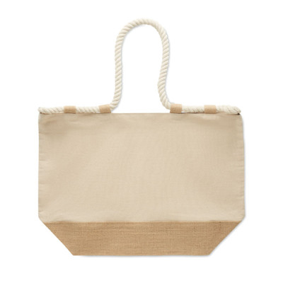 Saco de praia em lona de algodão de 280 gr/m² e juta com alças em cordão. Possui fecho de correr, fundo revestido a juta e 10 argolas de juta.