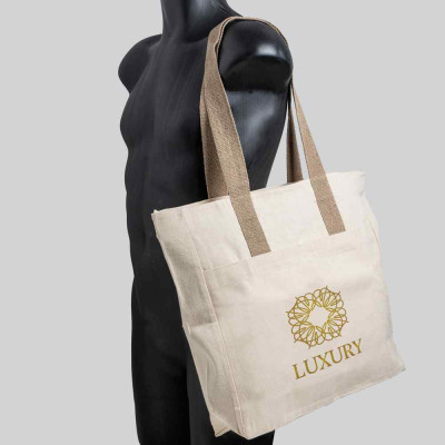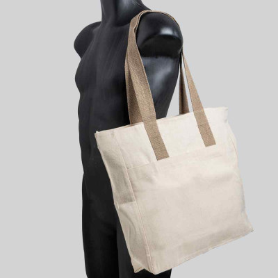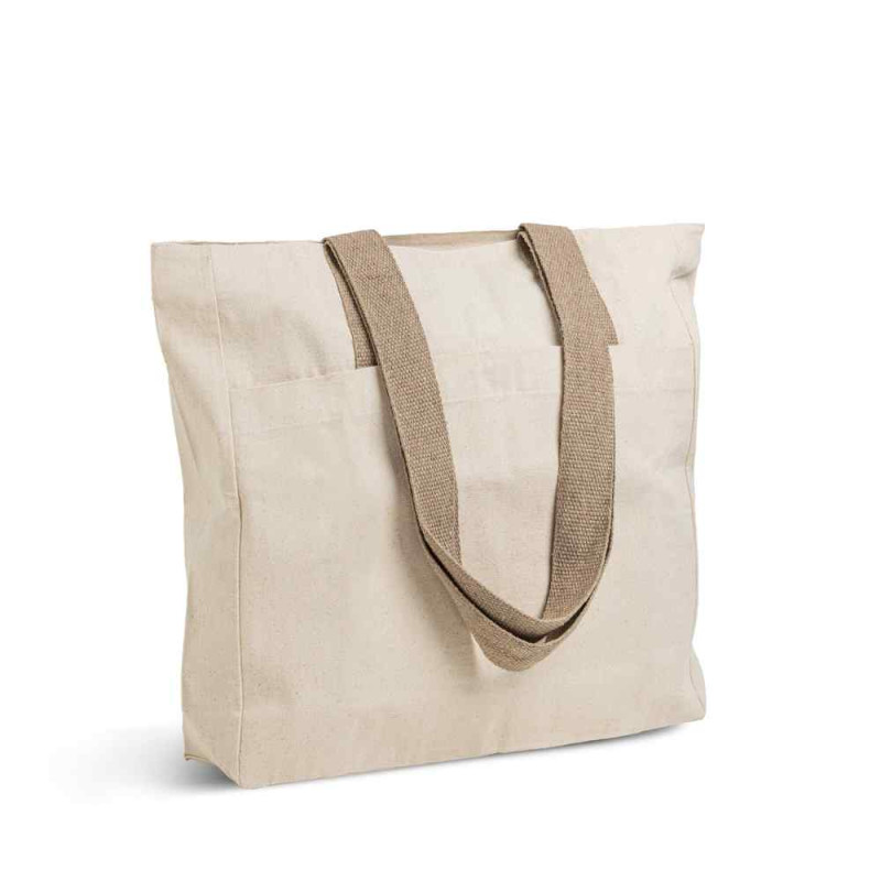 Um saco elegante e versátil, confeccionado em 100% algodão canvas de 280 g/m², produzido em conformidade com a norma OEKO-TEX®, que garante a ausência de substâncias nocivas na sua composição. Este saco distingue-se pelo compartimento principal espaçoso, com fecho, ideal para transportar documentos, compras ou materiais de trabalho. Além disso, dispõe de um bolso frontal exterior com fecho magnético e de um bolso interior, assegurando uma organização eficiente dos seus pertences. As alças coloridas acrescentam um toque de estilo e são confortáveis para uso ao ombro. Para além da funcionalidade, este saco promove a sua marca com sofisticação e reforça o compromisso com a sustentabilidade.
