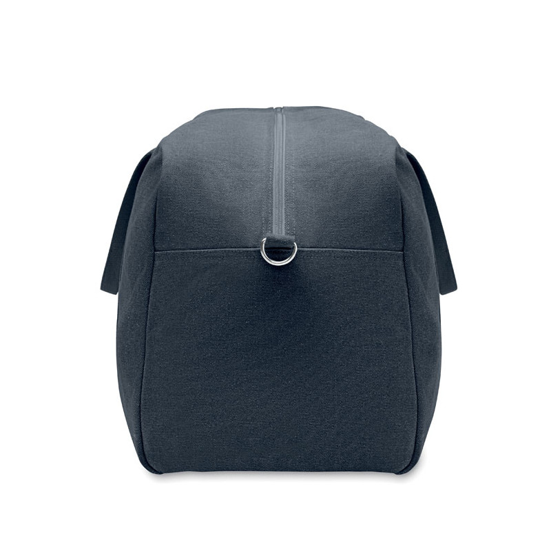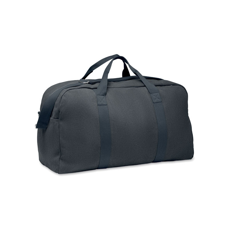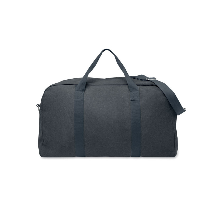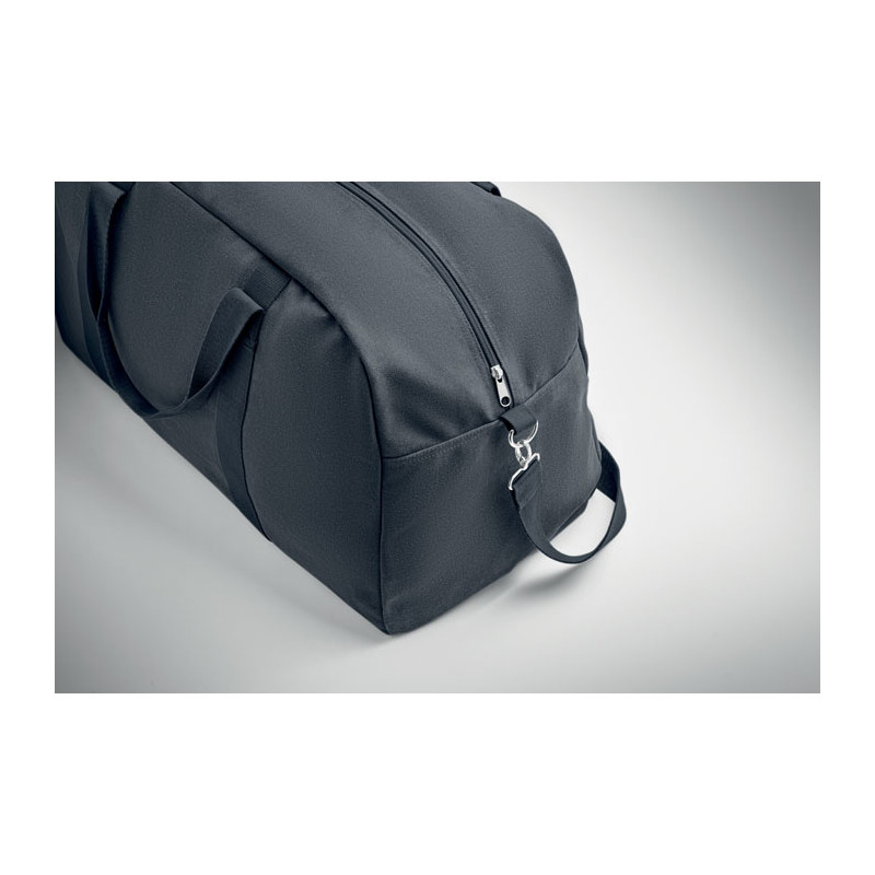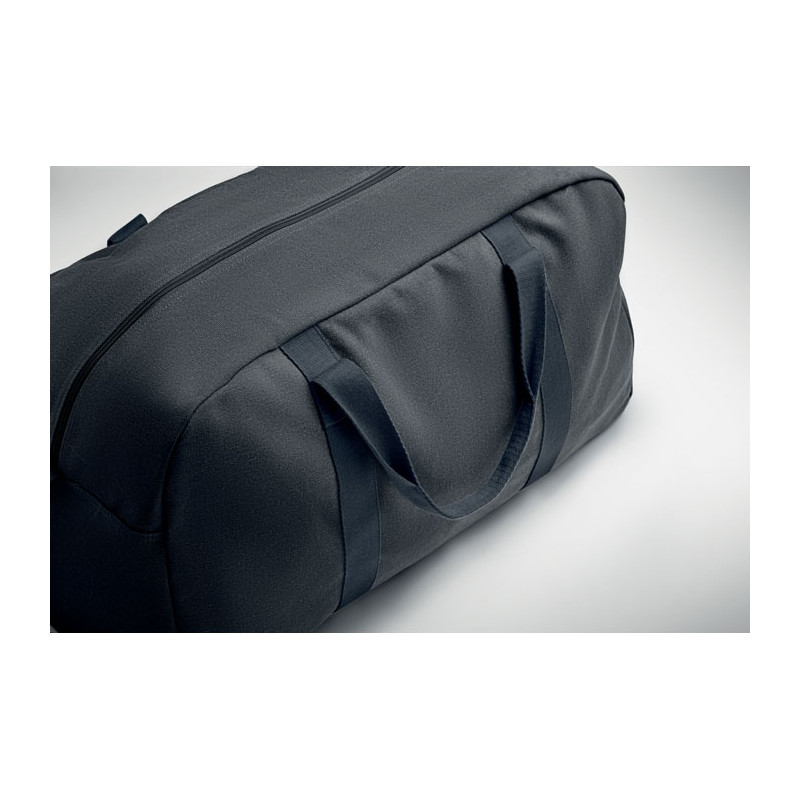 Saco de viagem Duffle em tecido reciclado de 450 gr/m² (60% algodão reciclado e 40% poliéster reciclado) com alça de algodão ajustável e amovível.