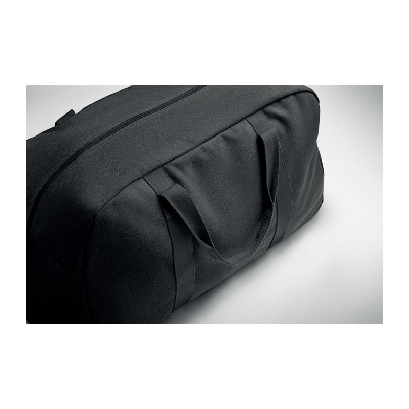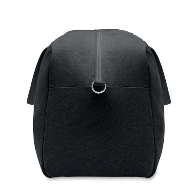 Saco de viagem Duffle em tecido reciclado de 450 gr/m² (60% algodão reciclado e 40% poliéster reciclado) com alça de algodão ajustável e amovível.