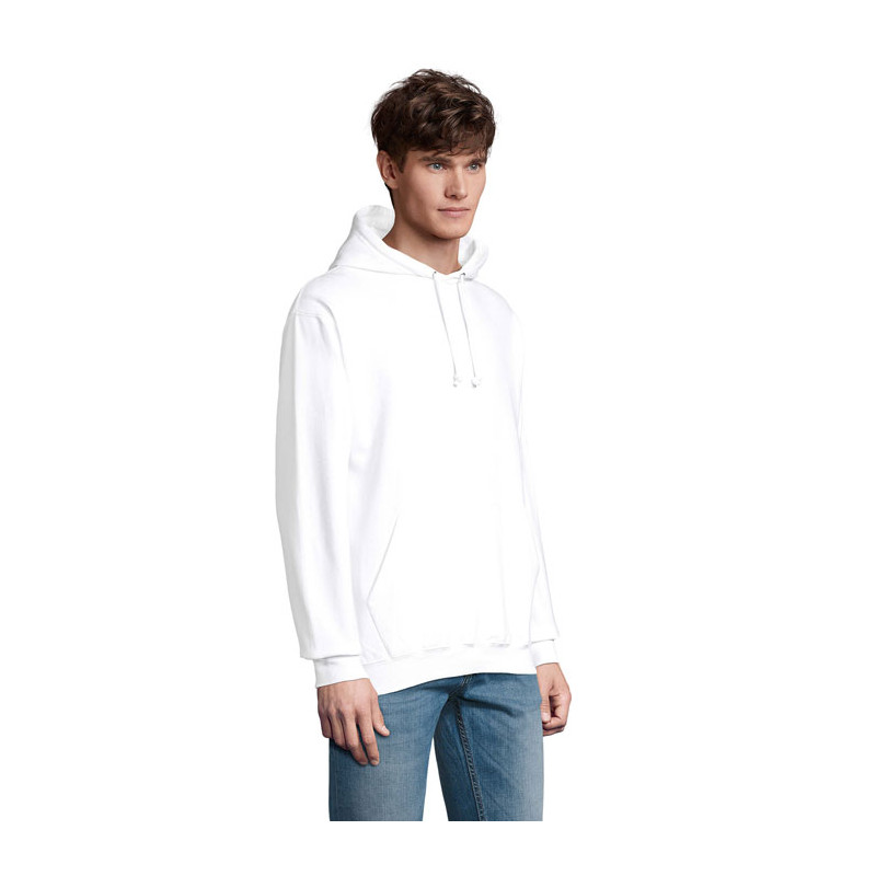 SOL'S CONDOR, Sweatshirt com capuz unissexo, 80% algodão - 20% poliéster reciclado com certificação Grs. Velo escovado 280 com mangas ajustadas, punhos, gola e bainha com canelado 1X1. Bolso canguru, capuz forrado com cordão em tom sobre tom e ilhós de metal. Sobre a correspondência de tamanhos, consulte a tabela de tamanhos na secção de documentação do produto.