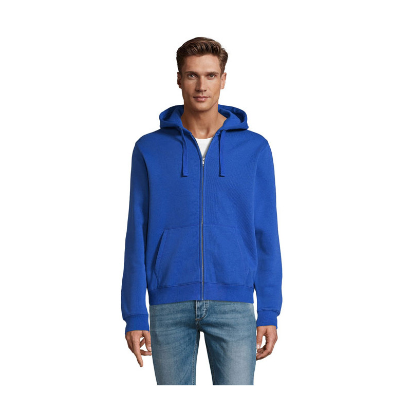 SOL'S SPIKE MEN. Sweatshirt com capuz e fecho de correr para homem, 80% algodão ''ringspun'' - 20% poliéster, interior cardado, exterior: 100% algodão FLEECE 280 LSF (Low Shrinkage Fabric - tecido de baixo encolhimento), mangas inseridas, 2 bolsos frontais, cortada e cosida, capuz forrado com cordão a condizer, punhos e bainha canelados 2x2, gola interior em meia-lua, gola com fita adesiva, fecho de correr YKK. OEKO-TEX®. Só vendido com impressão.