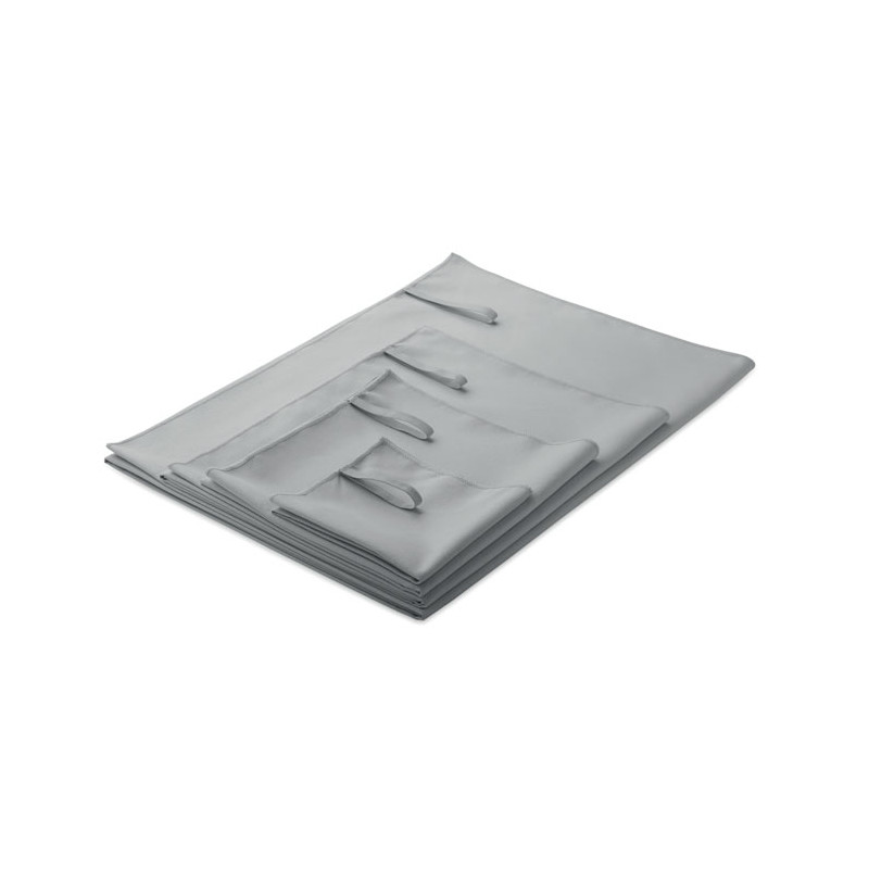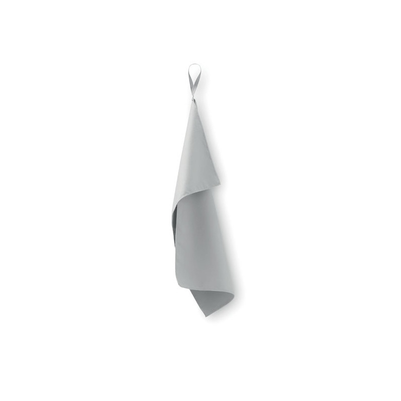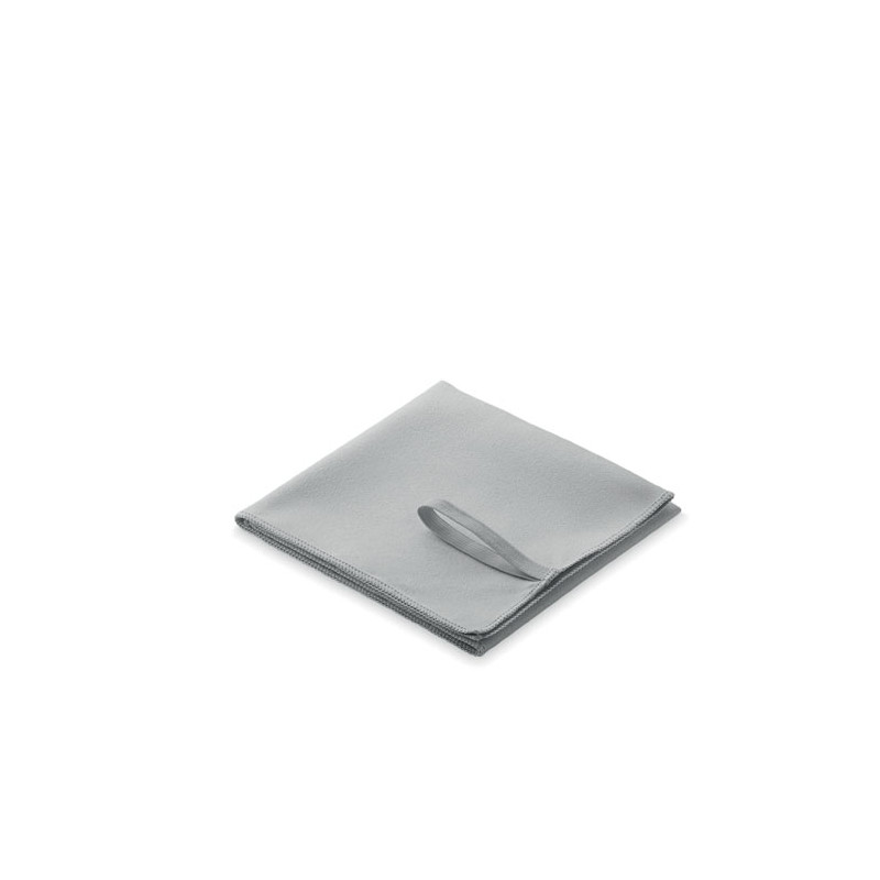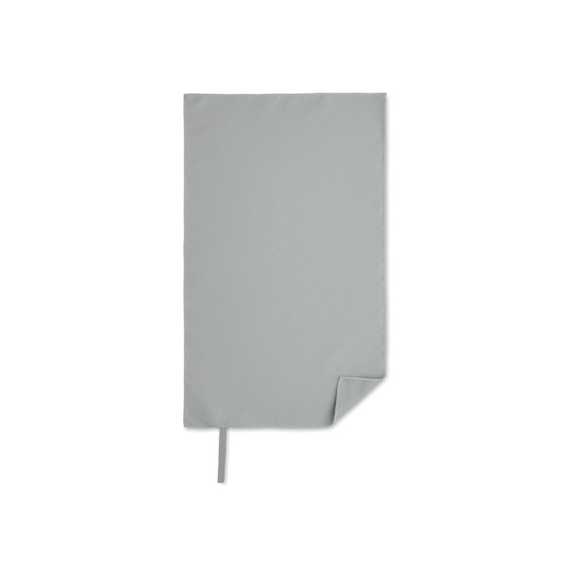 Toalha de microfibra em 90% poliéster e 10% poliamida com pega elástica. Leve e de secagem rápida. Tamanho 30cm x 50cm.